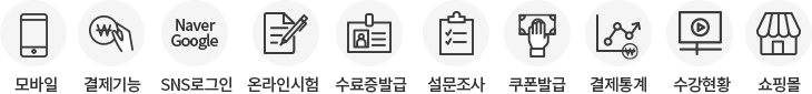 쇼핑몰 기능이 제공됩니다. (쇼핑몰모듈 구매시). 교재 및 기타 판매가 가능하며 결제시스템 연동이 가능하고 주문관리가 가능합니다. 상품관리를 위한 관리자 시스템도 제공됩니다.
